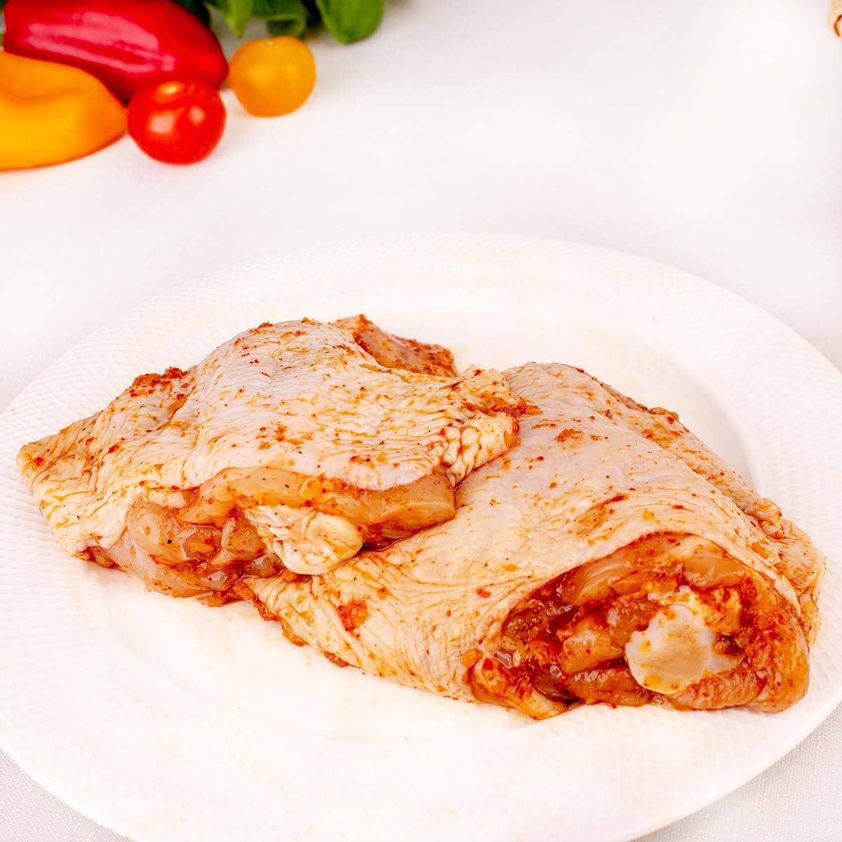 Цыпленок-бройлер, аджика острая, чеснок, масло подсолнечное, соль, перец черный молотый.