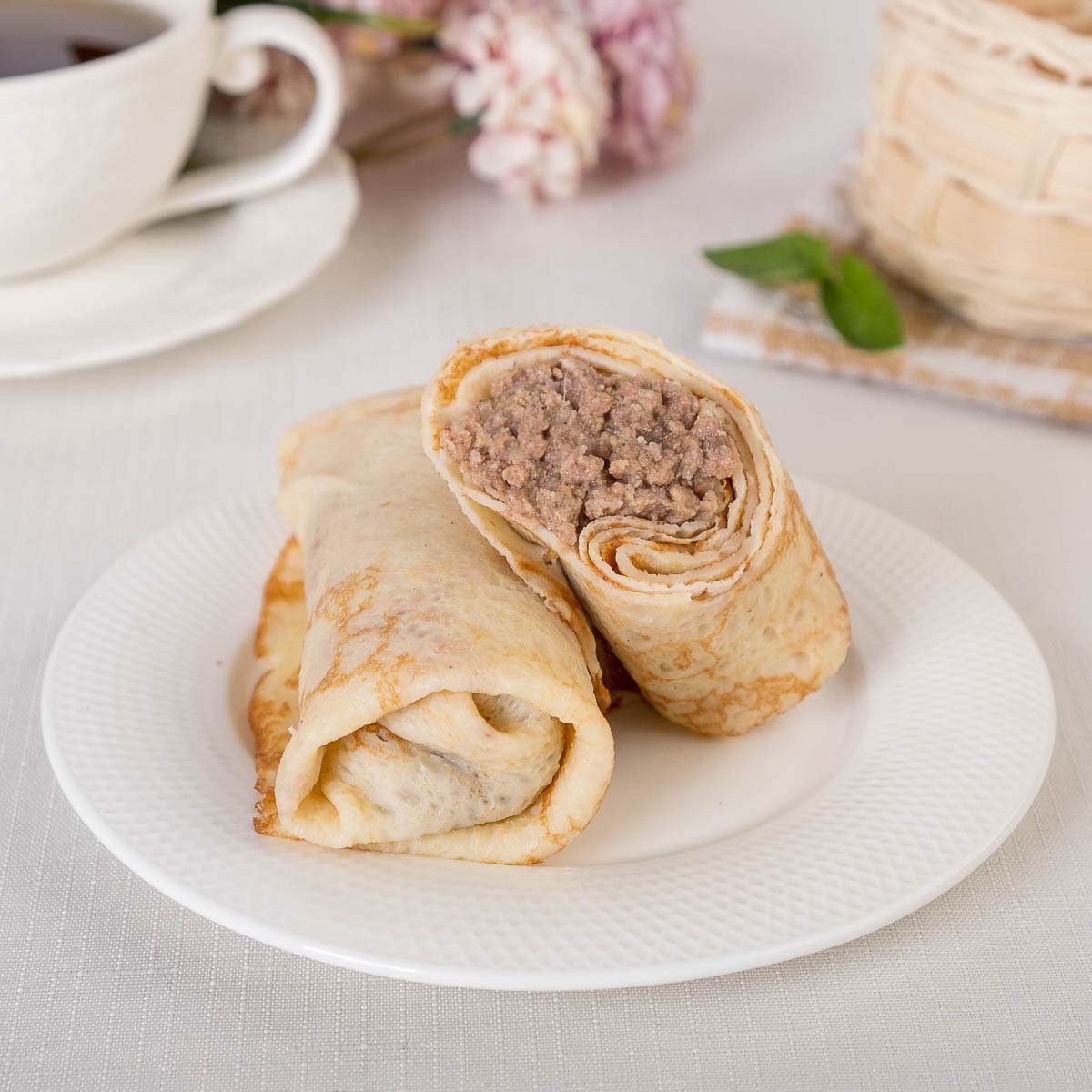 Для блинов: мука пшеничная в/с, яйцо куриное, сахар-песок, соль поваренная пищевая, масло подсолнечное, масло сливочнное, молоко. Для начинки: свинина, говядина, соль пищевая, перец черный молотый, масло подсолнечное.