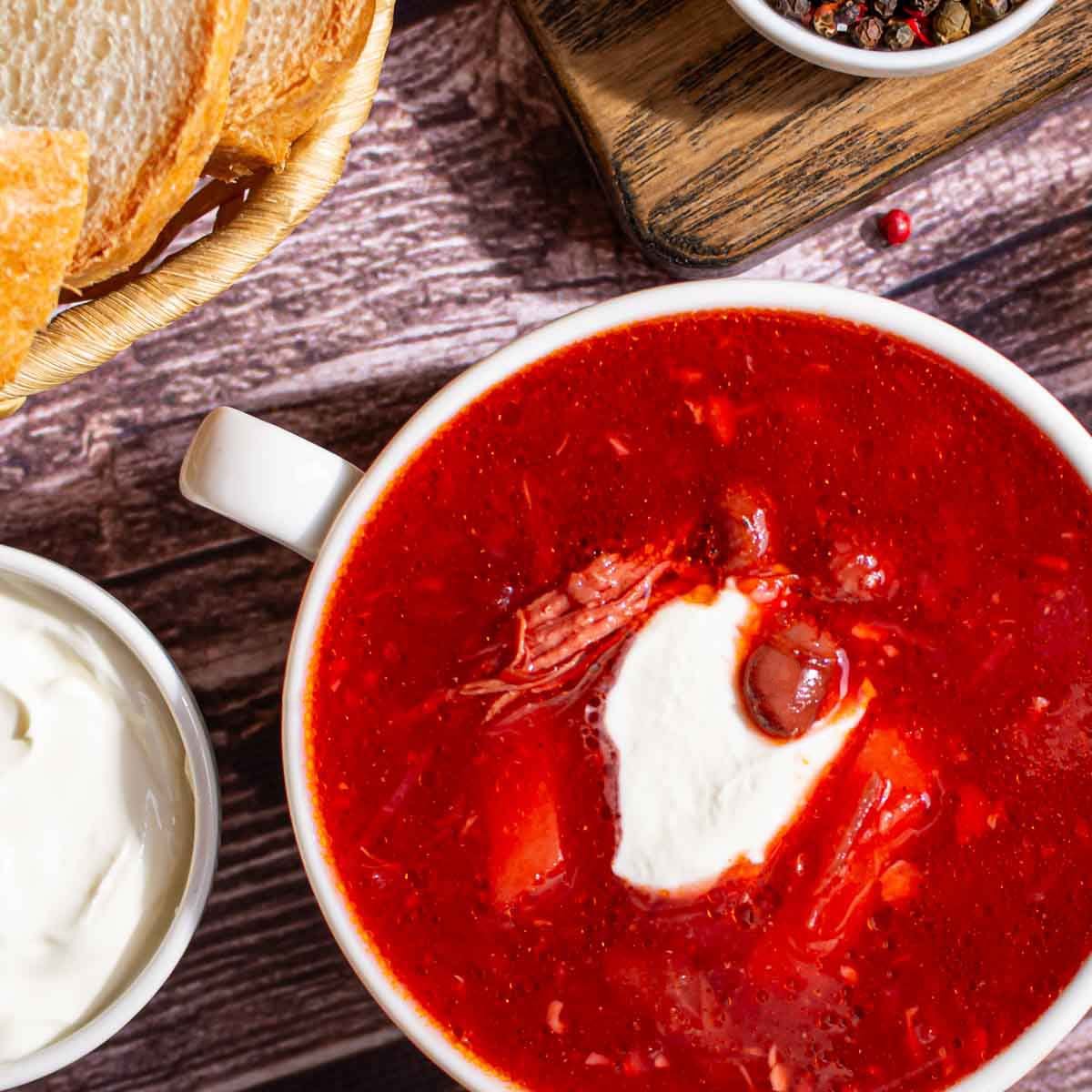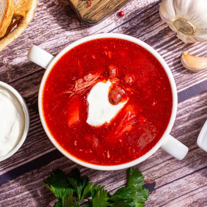 Говядина, свекла, картофель, капуста белокочанная, лук репчатый, морковь, масло подсолнечное, фасоль консервированная красная, томаты, перец болгарский, томатная паста, соус перечный острый, зелень укропа, чеснок свежий, уксус, соль, перец ч/м, лавровый лист.