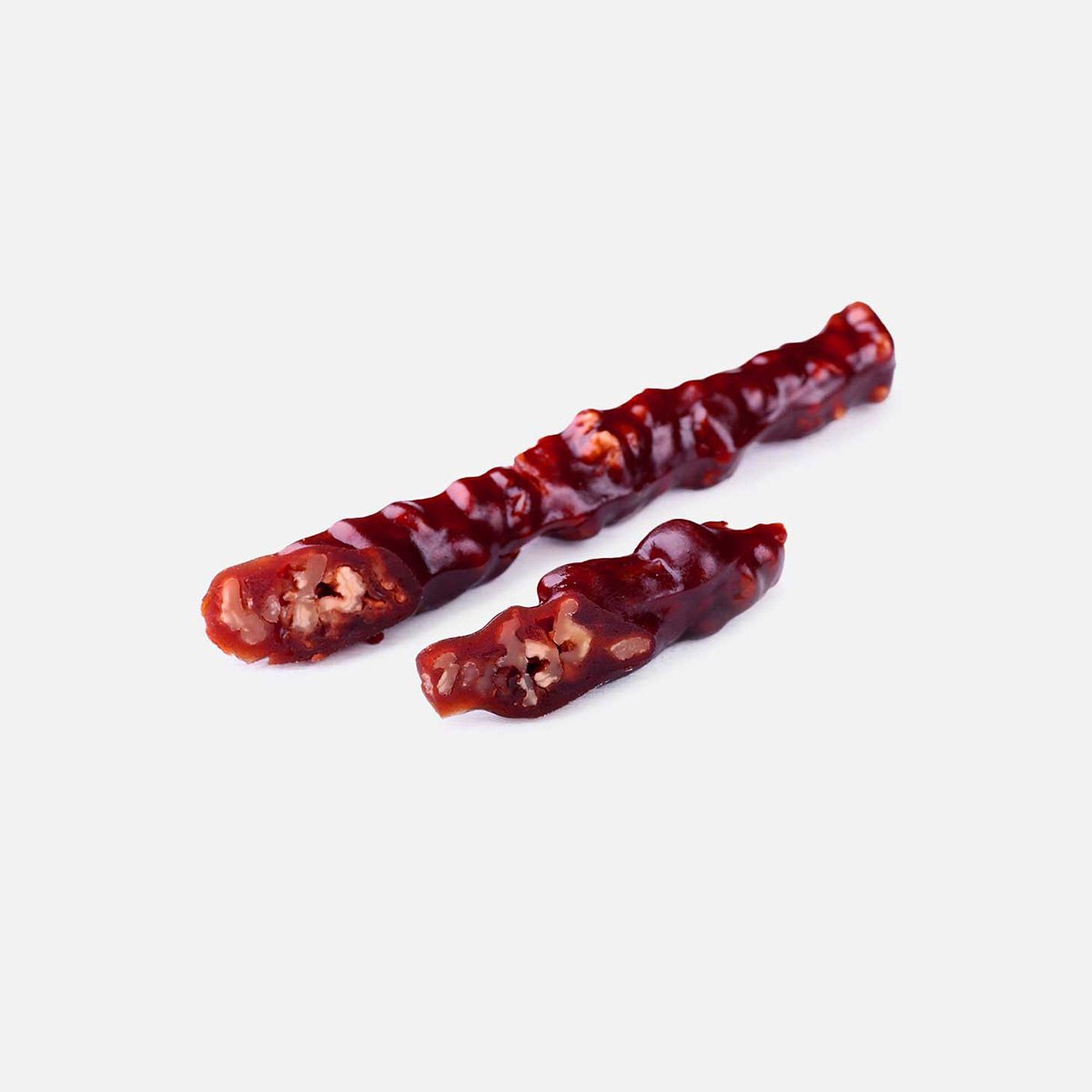 Черная смородина подарила этому десерту свой характерный вкус, неповторимый аромат и темно-рубиновый цвет. Грецкие орехи насытили его маслянистой сладостью и богатым составом микроэлементов и минералов. Чурчхела по нашему фирменному рецепту из сезонных ягод – полезное и необычное лакомство.