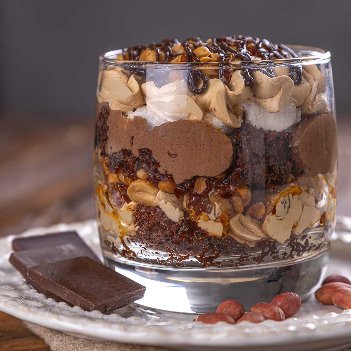 Крем (сливки, молоко сгущенное вареное), сахар, крем шоколадно-ореховый, арахис, крем (сливки животные, сливки растительные, пудра сахарная, ванилин), бисквит (сметана, молоко сгущенное, мука пшеничная в/с, сахар, яйцо куриное, какао порошок, сода), сироп (сахар, коньяк, ароматизатор Ром), меренга (сахар, яйцо куриное, кислота лимонная, ванилин).