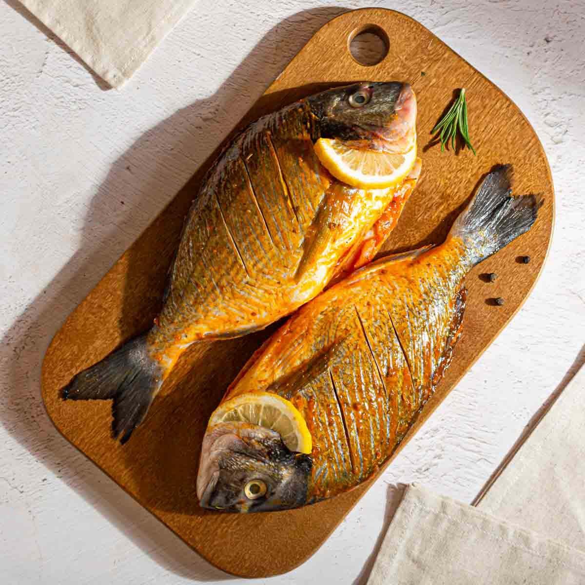 Рыба дорадо, маринад средиземноморский с белым вином, лимон, подсолнечное масло
