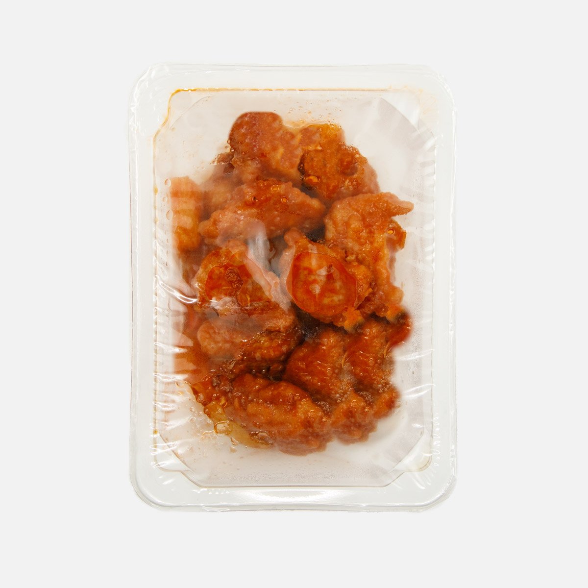 Филе цыпленка, перец болгарский, ананас консервированный, кетчуп, сахар, соевый соус, вино белое, крахмал картофельный, сок лимона, соль, перец красный молотый острый. Упаковано с применением условий модифицированной атмосферы.