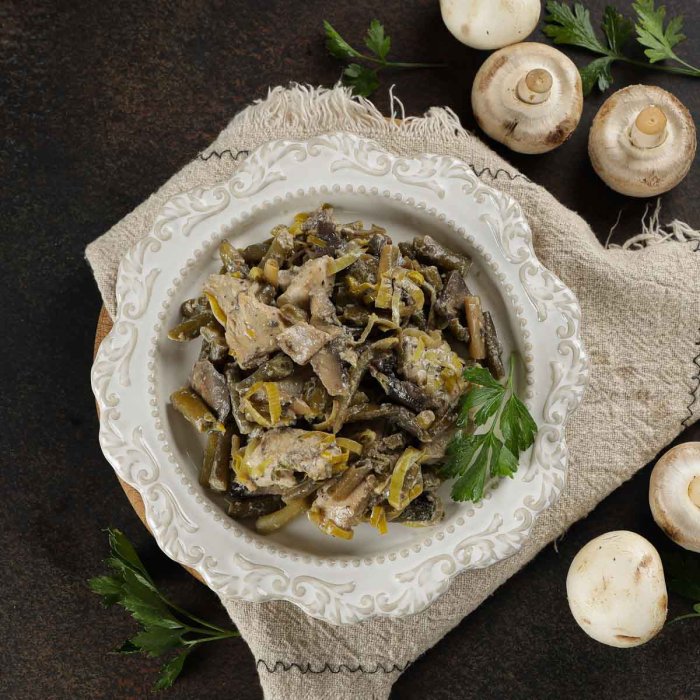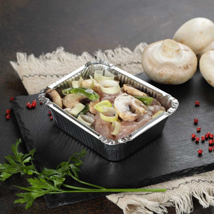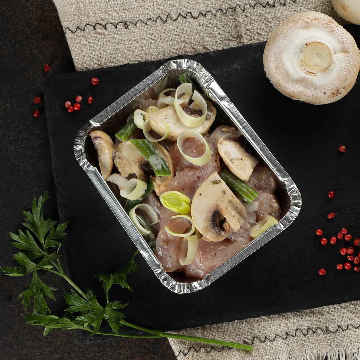 Филе индейки, фасоль стручковая, шампиньоны свежие, лук порей, масло растительное, соус грибной (шампиньоны свежие, грибы белые с/м, лук репчатый, сливки 33%, масло подсолнечное, мускатный орех, соль пищевая).