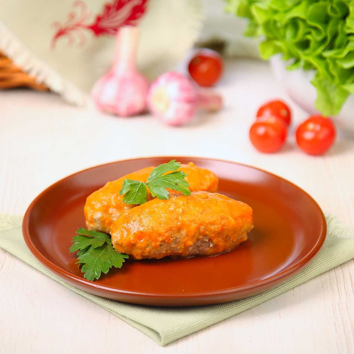 Капуста белокочанная, свинина, говядина, лук репчатый, рис, мука пшеничная в/с, морковь, масло подсолнечное, томатная паста, сметана, соль, сахар, перец черный молотый, перец черный горошек, лавровый лист.