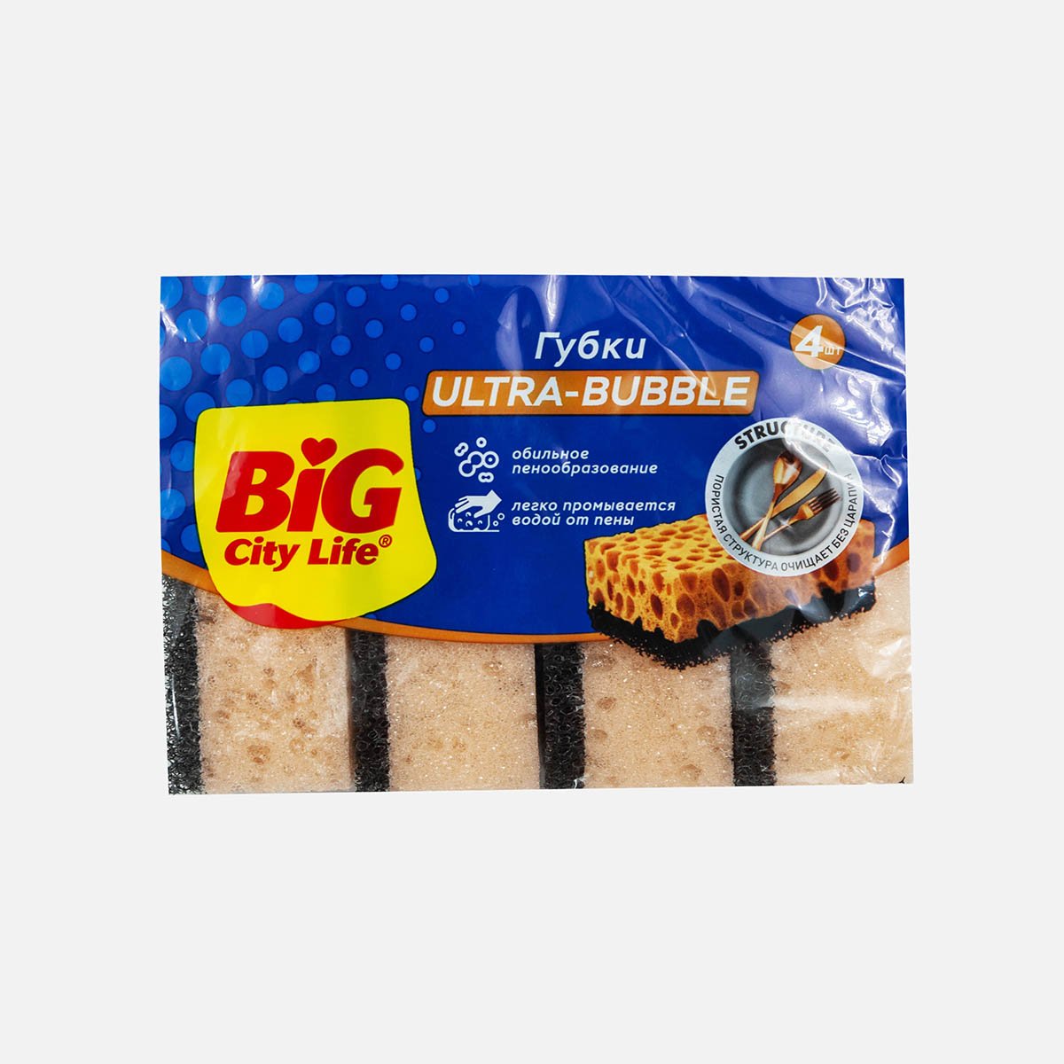 Губки Биг Сити кухонные крупнопорис Ультра бабли 4шт пенополиур