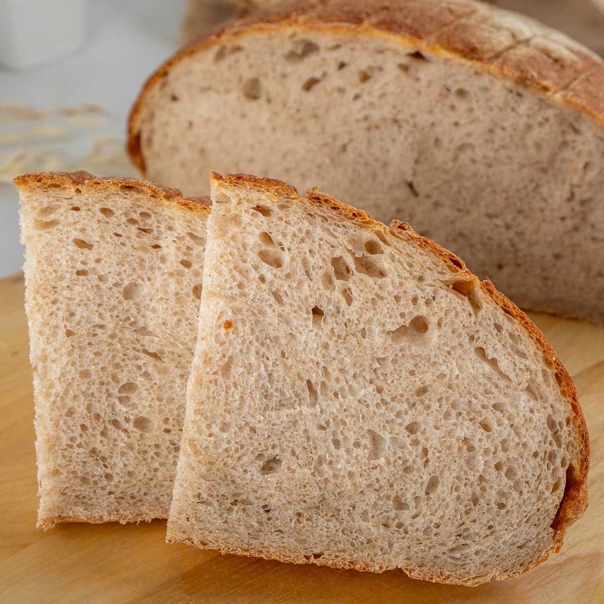 Испекли из смеси пшеничной и ржаной муки. Добавили ржаную закваску, она придает выпечке такой глубокий аромат и приятный, с кислинкой вкус. Вместо сливочного масла мы использовали яблочное повидло. Отличный вариант хлеба для веганов.