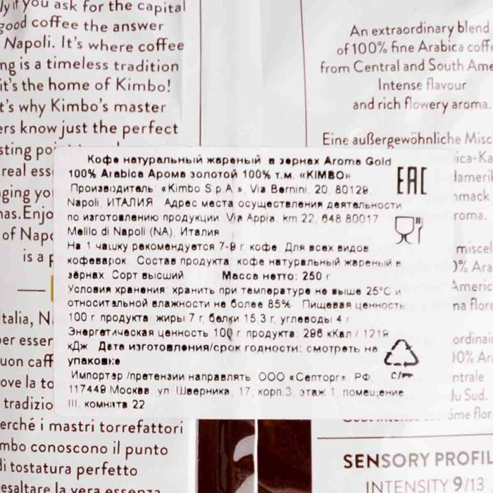 Кофе Кимбо Голд 100% Арабика зерно м/у 250г