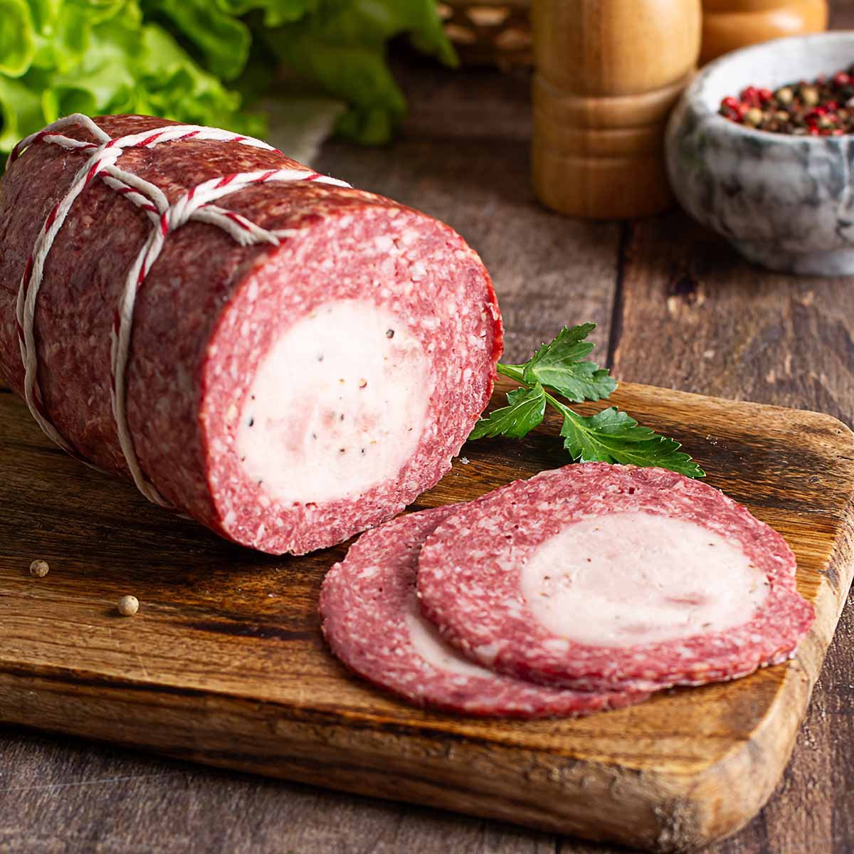 Колбаса в/к Пан-Мозар. Состав: свинина, говядина, куриное филе, шпик, соль нит., специи и пряности.