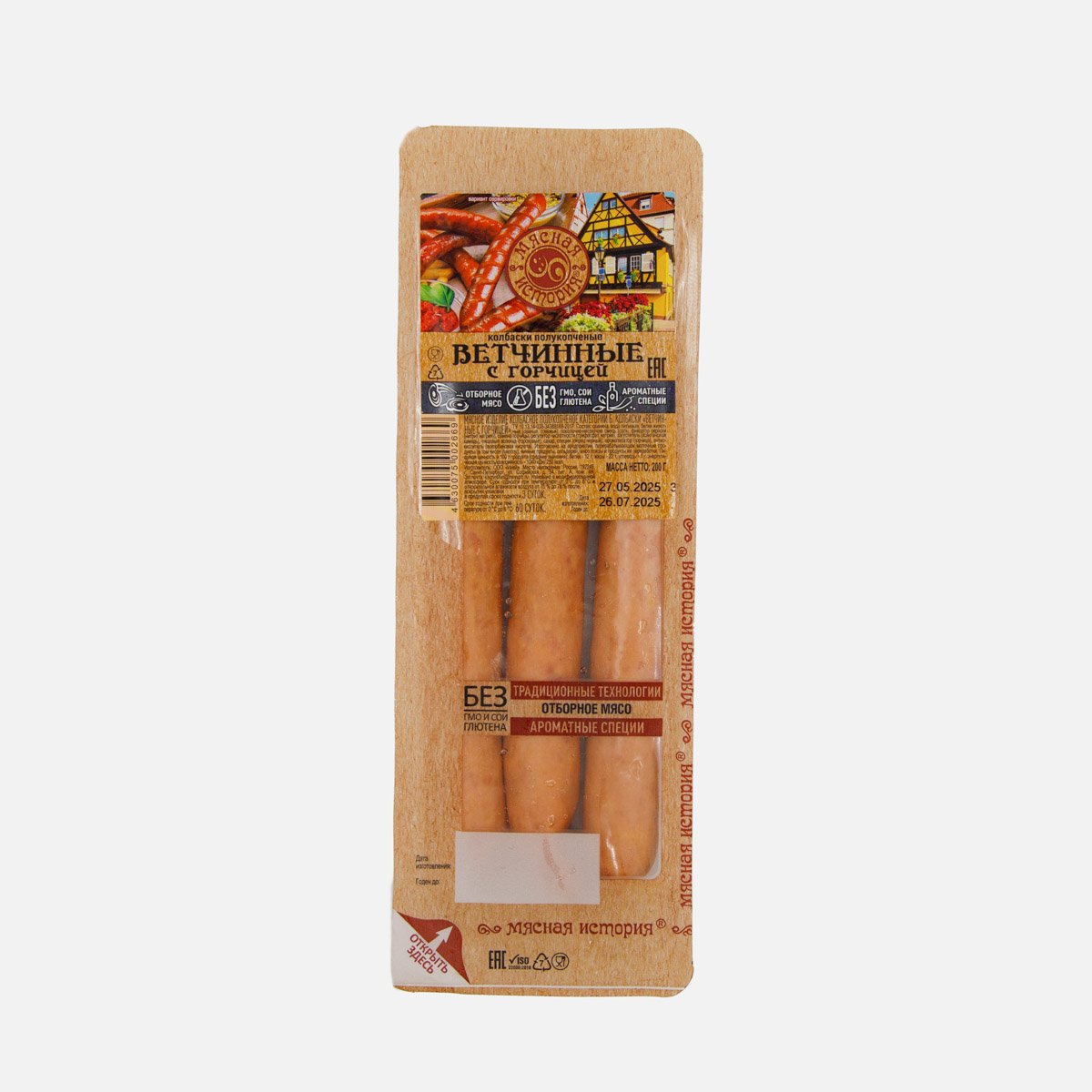 Колбаски Мясная история Ветчинные с горчицей п/к м/а 200г