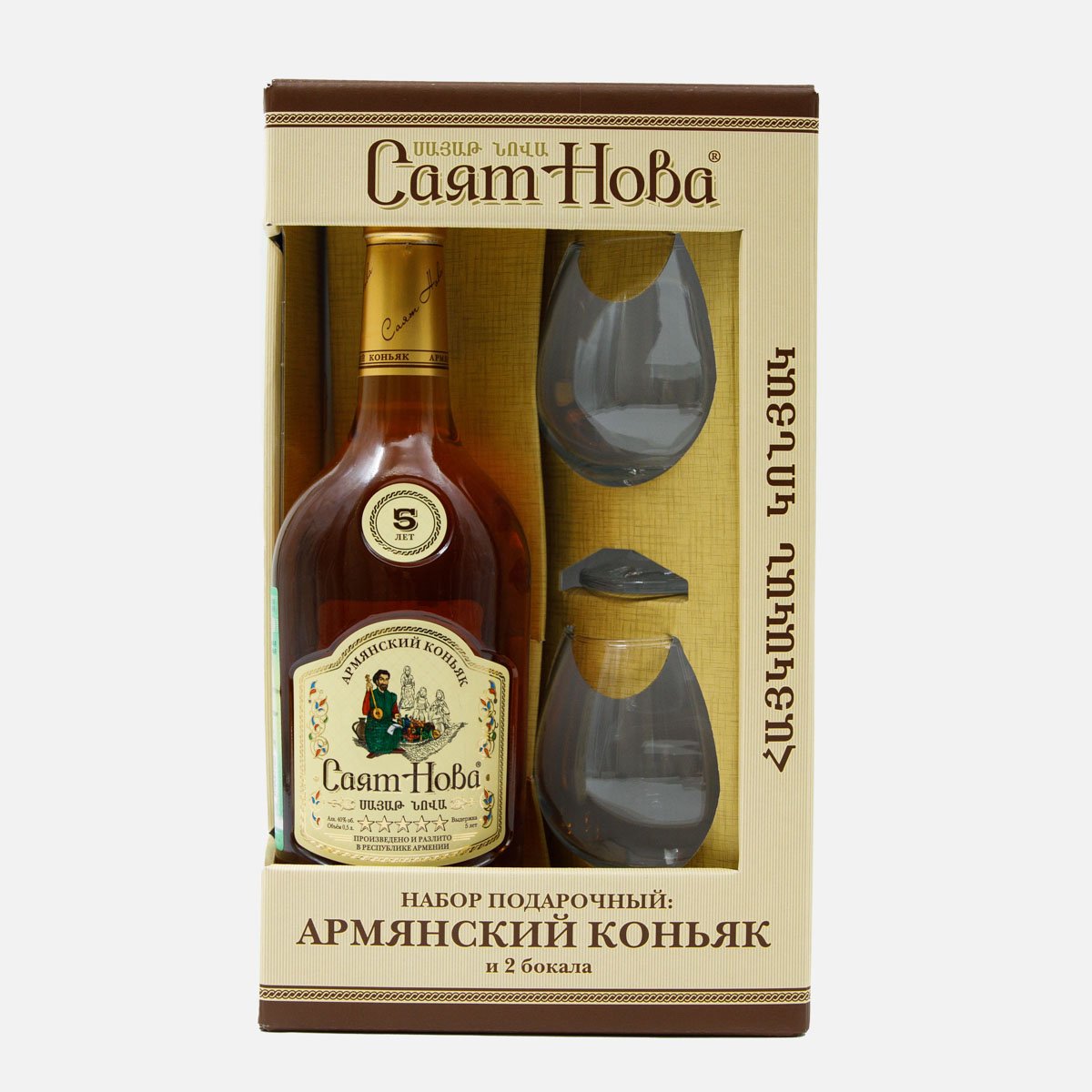 Коньяк Саят Нова пять звезд пятилет орд 40% п/у 0,5л+2 бокала