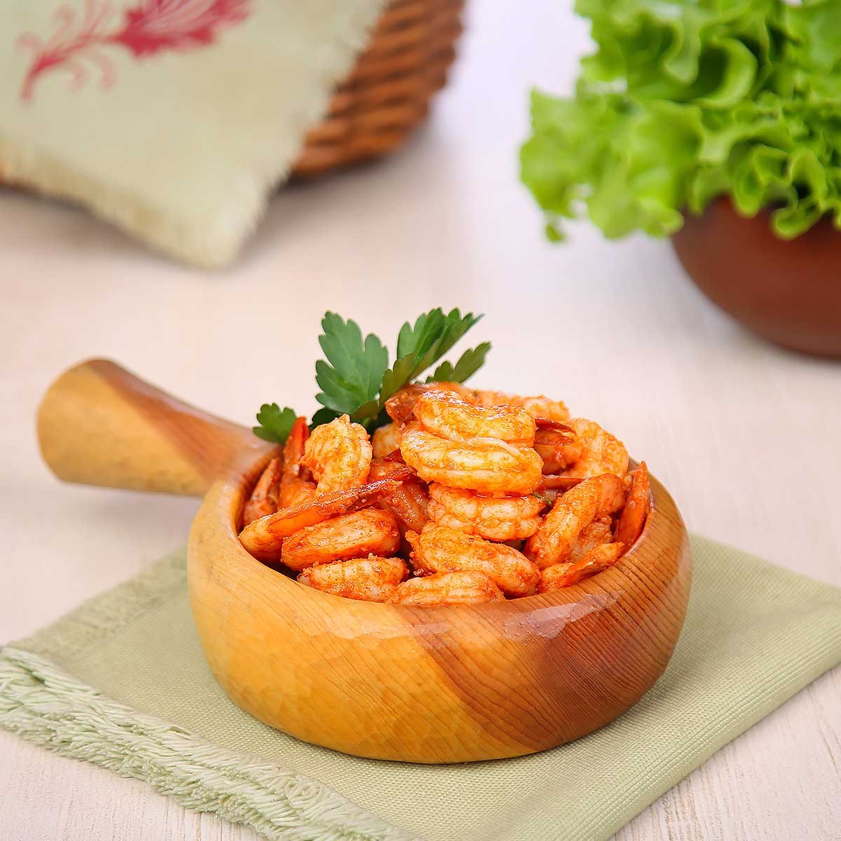 Креветки, лимон, масло оливковое, чеснок, соль, зелень, специи Паприка, перец красный молотый.
