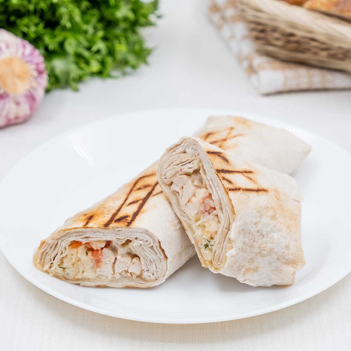 Лаваш, мякоть цыпленка, капуста белокочанная, морковь, томат, яйцо куриное, масло подсолнечное, сыр, сливки животные, аджика, соевый соус, уксус, сок лимона, чеснок, горчица, мед, соль, сахар, перец черный молотый.