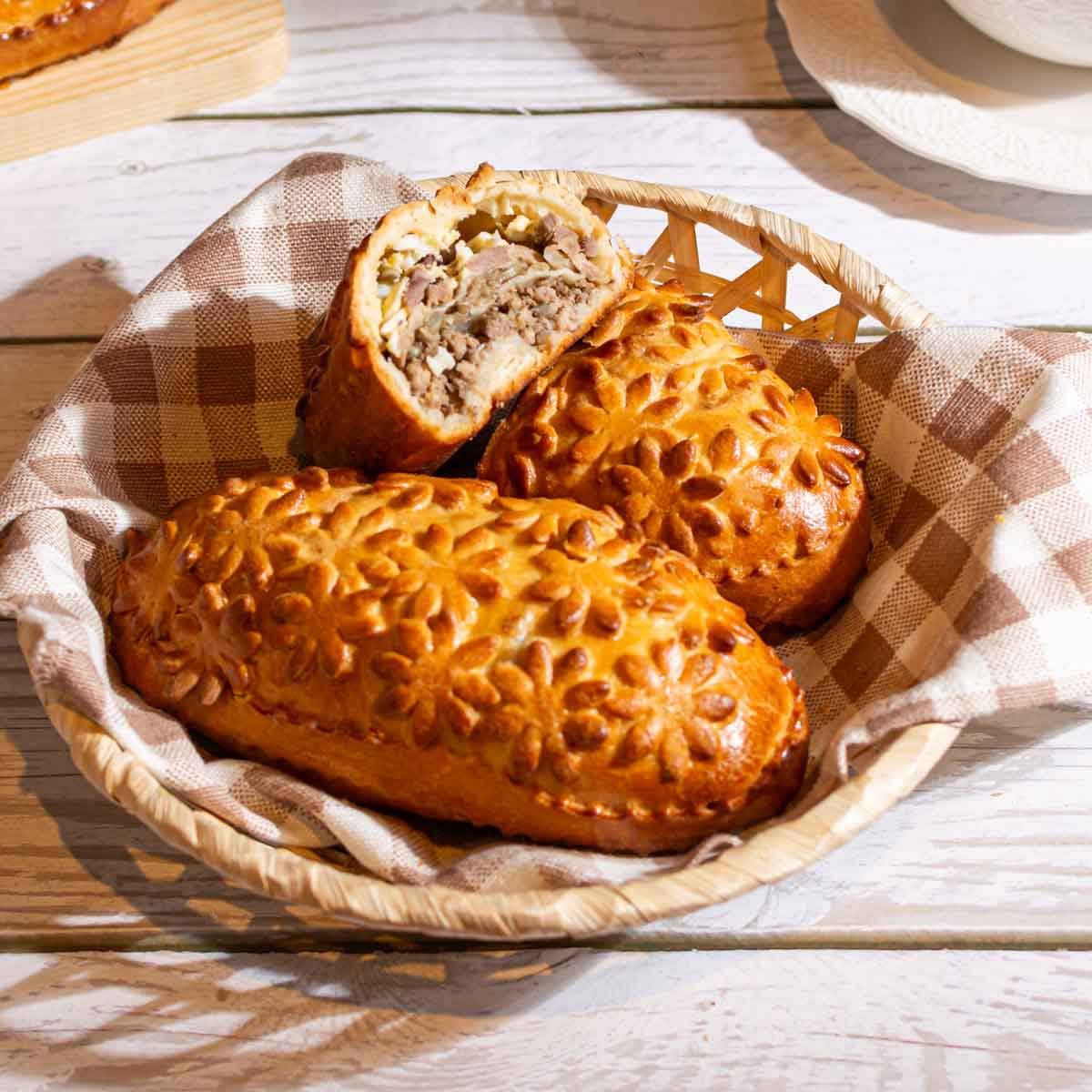 Тесто (мука пшеничная в/с, молоко, яйцо куриное, масло сливочное, сахар, сметана, дрожжи, соль, масло подсолнечное), начинка (лук репчатый, свинина, говядина, масло подсолнечное, соль, перец ч/м), язык говяжий, начинка (рис, масло сливочное, соль), начинка (лук репчатый, сливки, масло подсолнечное, грибы белые сухие, соль), начинка (яйцо куриное, масло сливочное, соль, перец ч/м), блинчики (молоко, мука пшеничная в/с, яйцо куриное, масло подсолнечное, сахар, соль), масло сливочное, яйцо куриное.