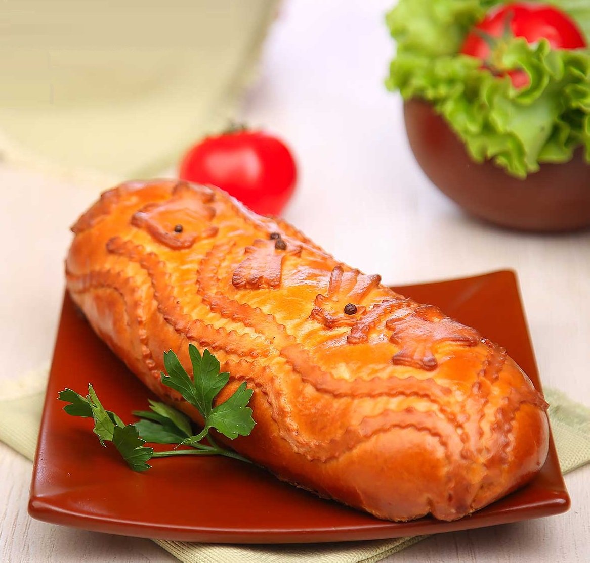Как вид выпечки, кулебяка возникла не позднее конца XVII века в северной монастырской кухне. Поэтому наиболее традиционной считается кулебяка с рыбной начинкой. В нашей кулебяке гармонично сочетаются два вида рыбы — судак и семга, — вкус которых удачно дополняет отварной рис с рубленым яйцом и белые грибы в сметанном соусе. Настоящая симфония вкусов, которая послужит как самостоятельным блюдом, так и гастрономической парой к рыбным супам, и в первую очередь — к ухе.