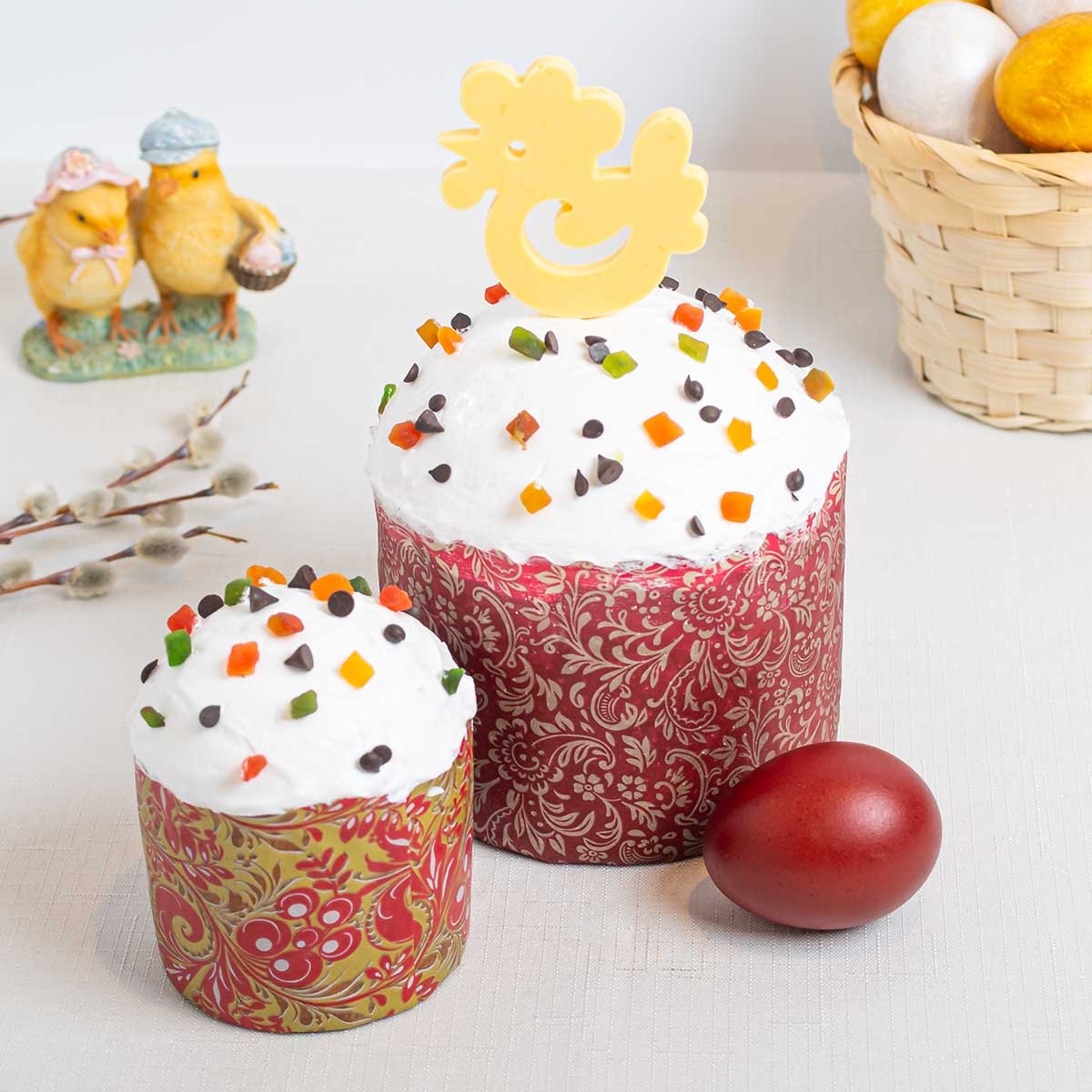Мука пшеничная в/с, молоко, сахар, крем (сахар, яйцо куриное, лимонная кислота, ванилин), цукаты, маргарин, изюм, глазурь шоколадная, сметана, яйцо куриное, дрожжи, глазурь шоколадная белая, соль, краситель пищевой