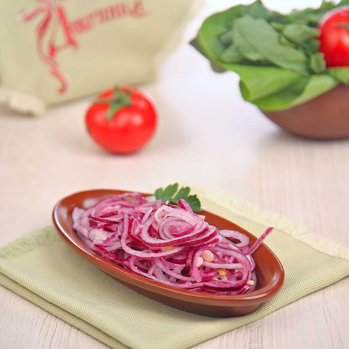 Лук красный репчатый, масло подсолнечное, уксус, сахар-песок, соль.
