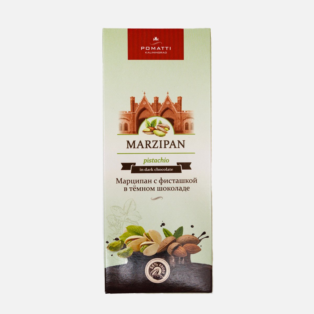 Марципан Поматти фисташковый в темном шоколаде 85г