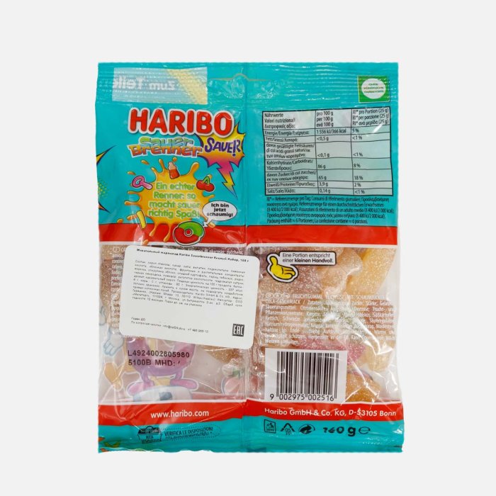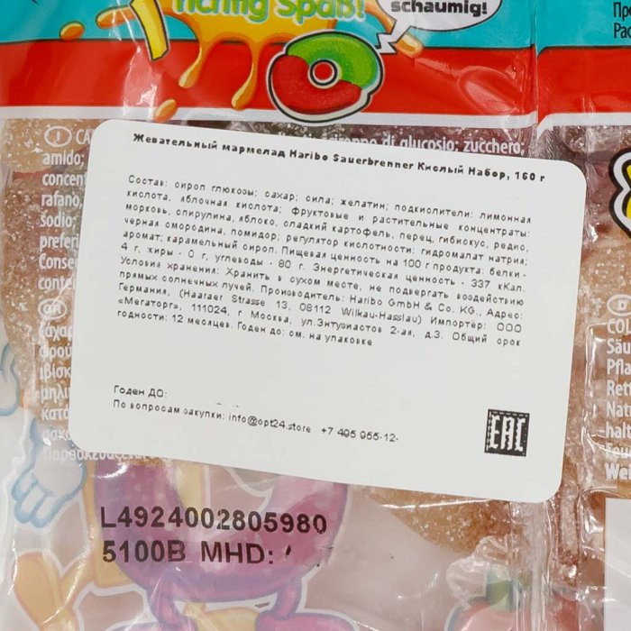 сироп глюкозы; сахар; сила; желатин; подкислители: лимонная кислота, яблочная кислота; фруктовые и растительные концентраты: морковь, спирулина, яблоко, сладкий картофель, перец, гибискус, редис, черная смородина, помидор; регулятор кислотности: гидромалат натрия; аромат; карамельный сироп.