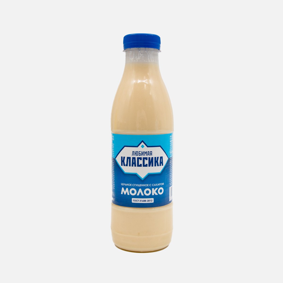 Цельное сгущенное молоко с сахаром "Любимая классика" 8,5% жирности в большой бутылке.