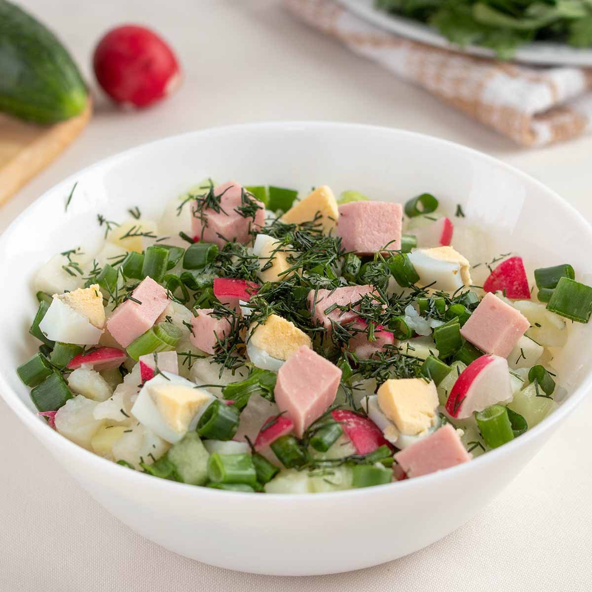 Колбаса вареная, картофель, яйцо куриное, огурцы свежие, редис, лук зеленый, зелень