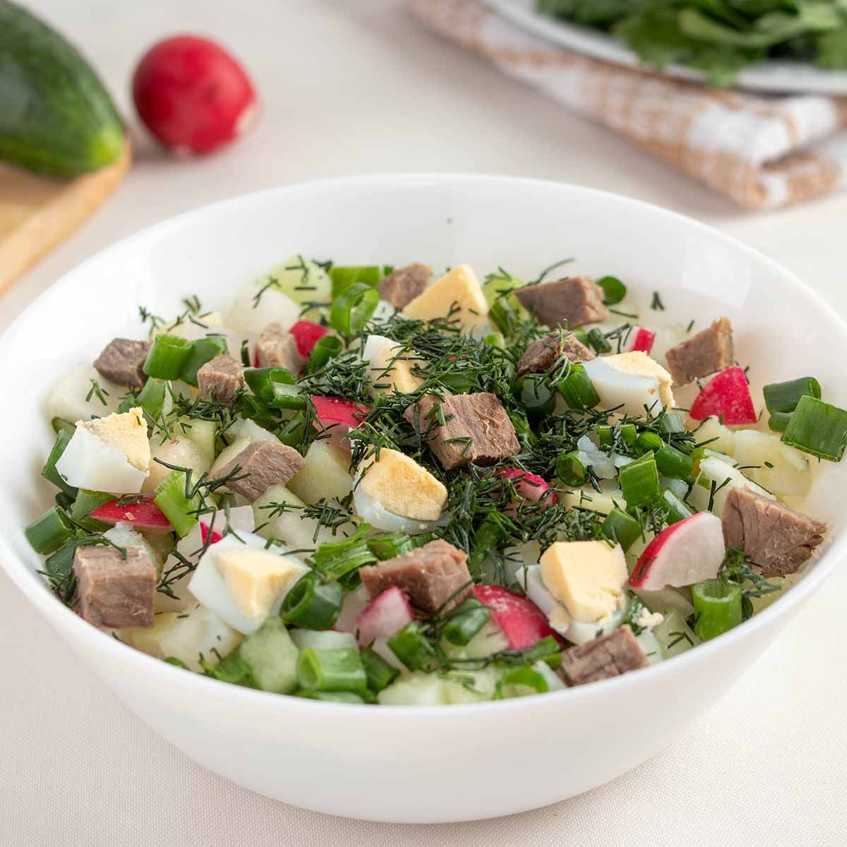 Мясо говядина, картофель, яйцо куриное, огурцы свежие, редис, лук зеленый, зелень