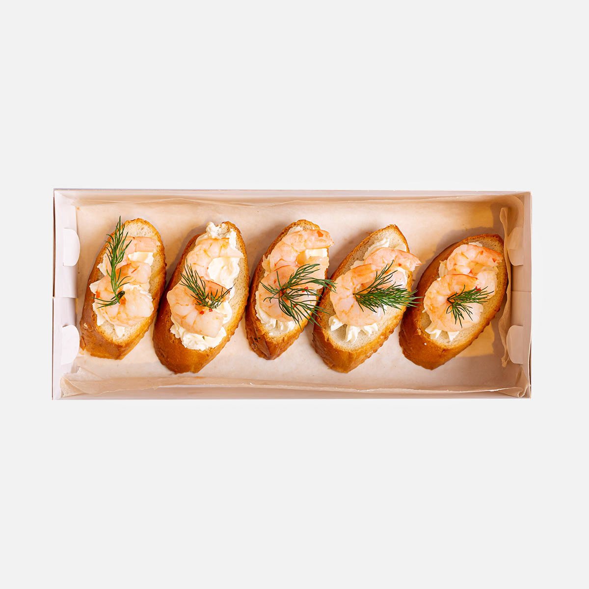 Батон, креветка, мусс (филе семги, сливки, сахар-песок, соль), укроп