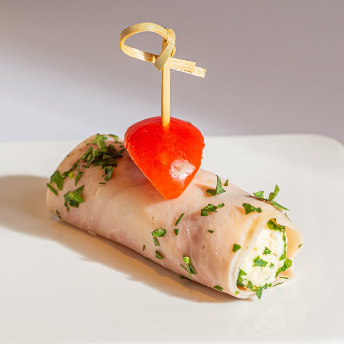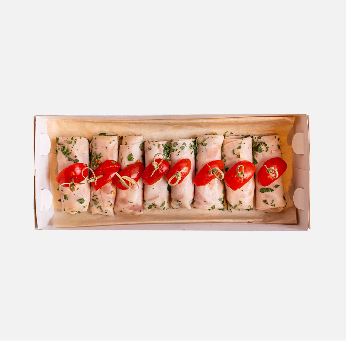 Ветчина, начинка (сыр моцарелла, майонез, яйцо куриное, чеснок, огурцы маринованные), томаты черри, зелень петрушки