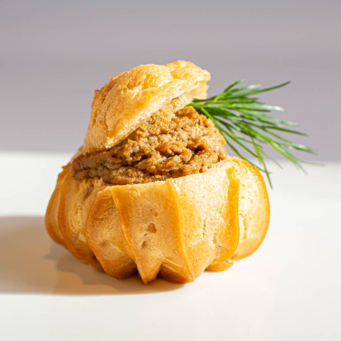 Профитроли (яйцо куриное, мука пшеничная в/с, масло сливочное, соль), паштет куриный (печень куриная, морковь, лук репчатый, сливки животные, масло сливочное, масло подсолнечное, чеснок, соль, перец черный молотый), петрушка