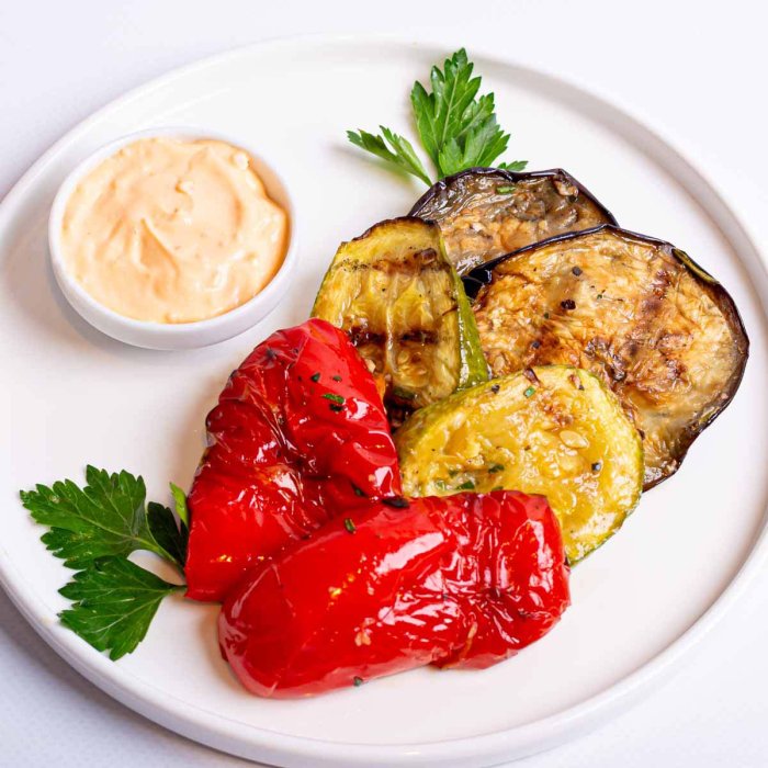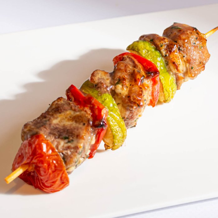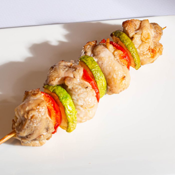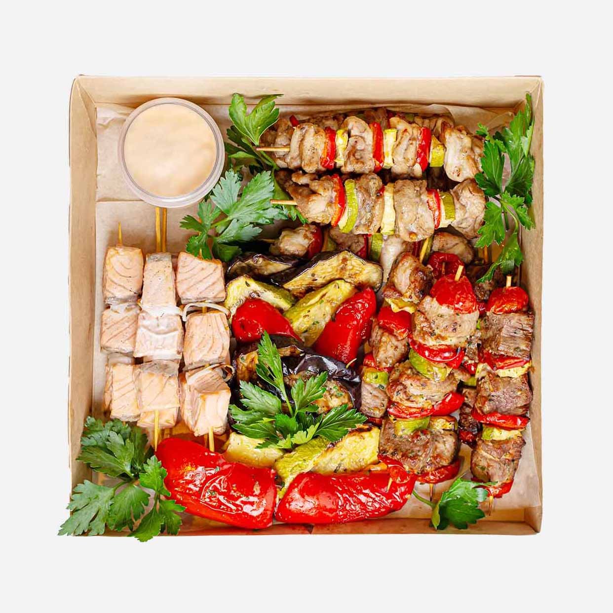 Шашлык мини из куриного мяса, Шашлык из свинины По-сибирски, Шашлычки мини из семги, Баклажаны гриль, Кабачки гриль, Перец болгарский гриль, Зелень укропа/петрушки, Соус Коктейль