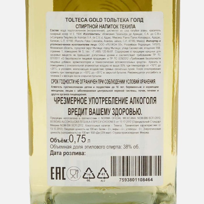 Напиток спиртной Текила Тольтека Голд 38% ст/б 0,75л