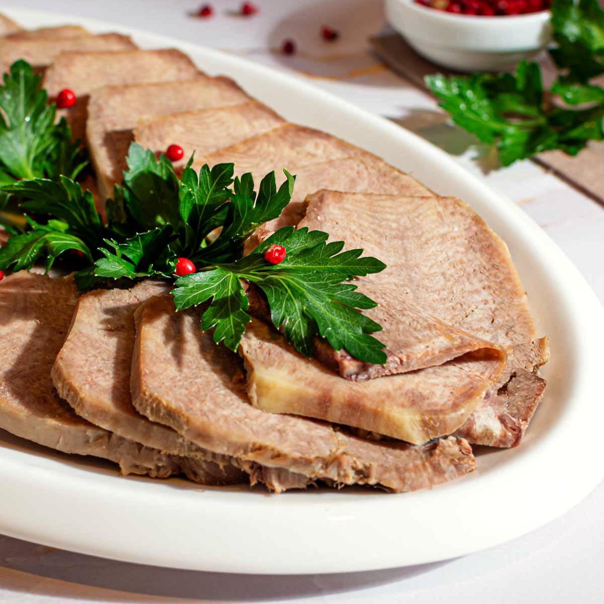Говяжий язык, приготовленный до мягкости, — деликатес, который говорит сам за себя. Натуральный особенный вкус этого нежного, но плотного мяса, деликатно подчеркнут грамотным набором специй и дополнен маслинами и свежей зеленью. Подавайте с острым хреном или горчицей.