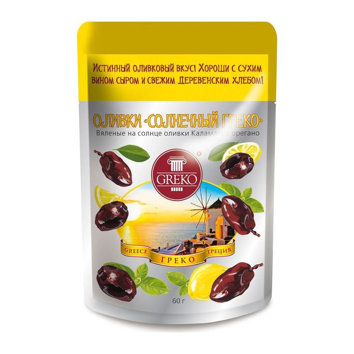 Оливки Греко Солнечный в масле 60г с орегано с/к пл/уп