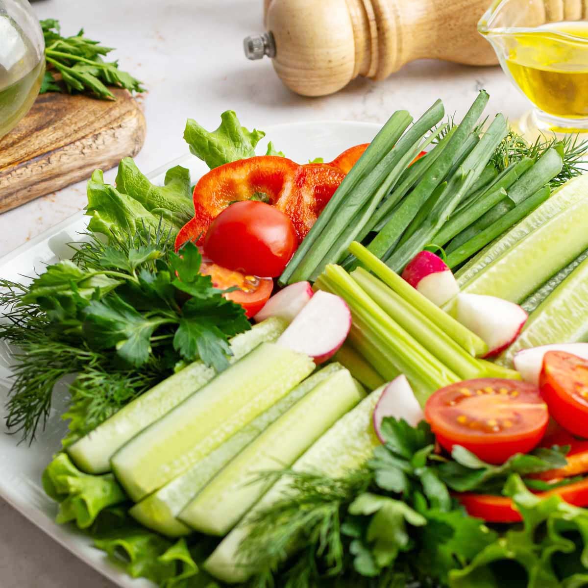 Огурцы свежие, томаты черри свежие, перец болгарский, редис, салат зелёный, сметана, майонез, зелень, чеснок.