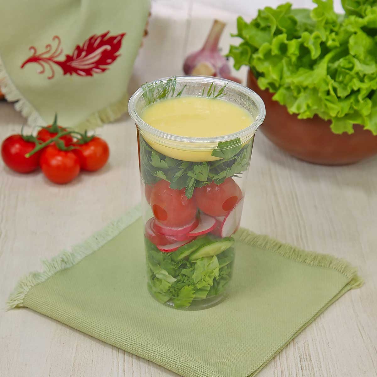 Огурец свежий, черри, редис, салат Афицион, зелень укропа, зелень петрушки, йогурт натуральный, масло оливковое, сыр Пармезан, яйцо куриное, горчица дижонская, чеснок, сок лимона, сахар, соль.
