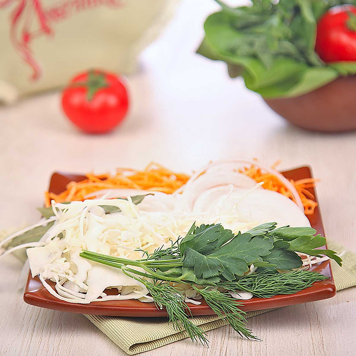 Картофель, капуста белокочанная, морковь, томаты, перец болгарский, лук репчатый, чеснок, сок лимона, зелень, перец душистый, лавровый лист.