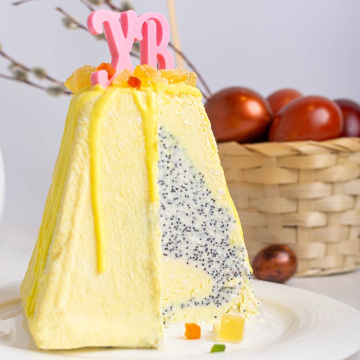Творог, сливки животные,покрытие крем Шокодель, яйцо куриное, масло сливочное, сахар, мак, мармелад, глазурь шоколадная, меренга (безе), ванилин