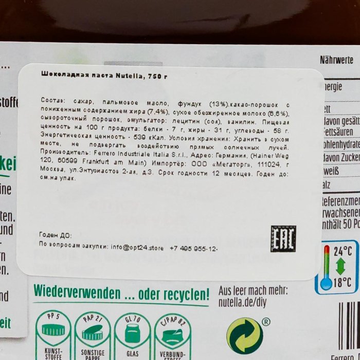 Паста Нутелла шоколадная 750г