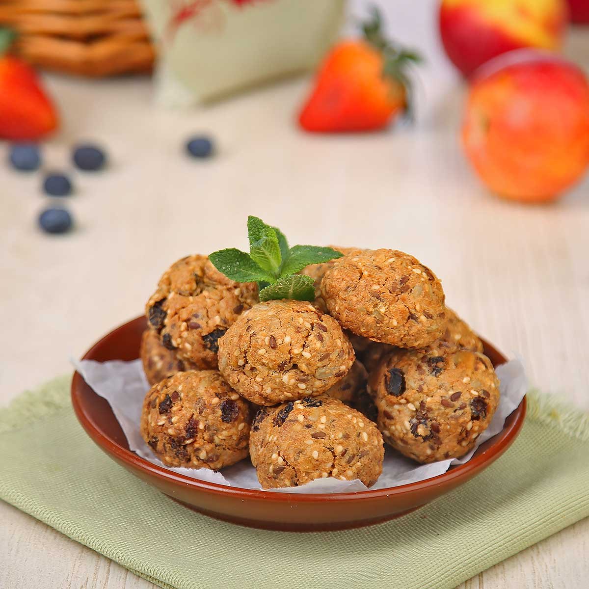 Хлопья овсяные, масло сливочное, сахар, семена подсолнуха, яйцо куриное, изюм, орех грецкий, семя кунжута, семя льна.