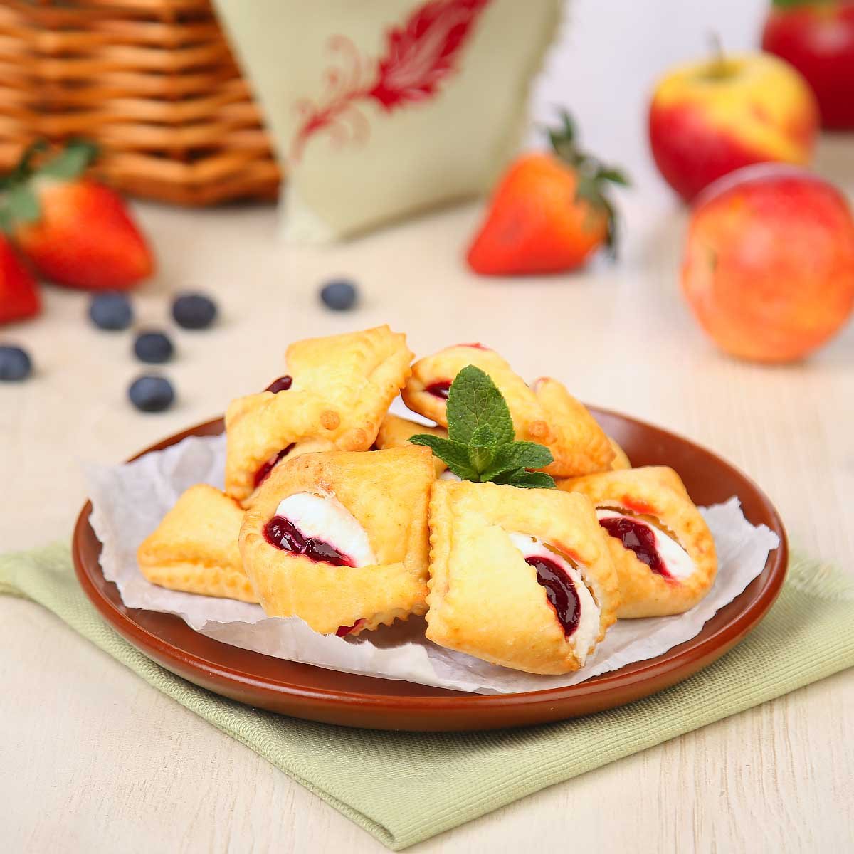 Начинка Творог, мука пшеничная в/с, начинка Вишня, творог, масло сливочное, яйцо куриное, сметана, сода.
