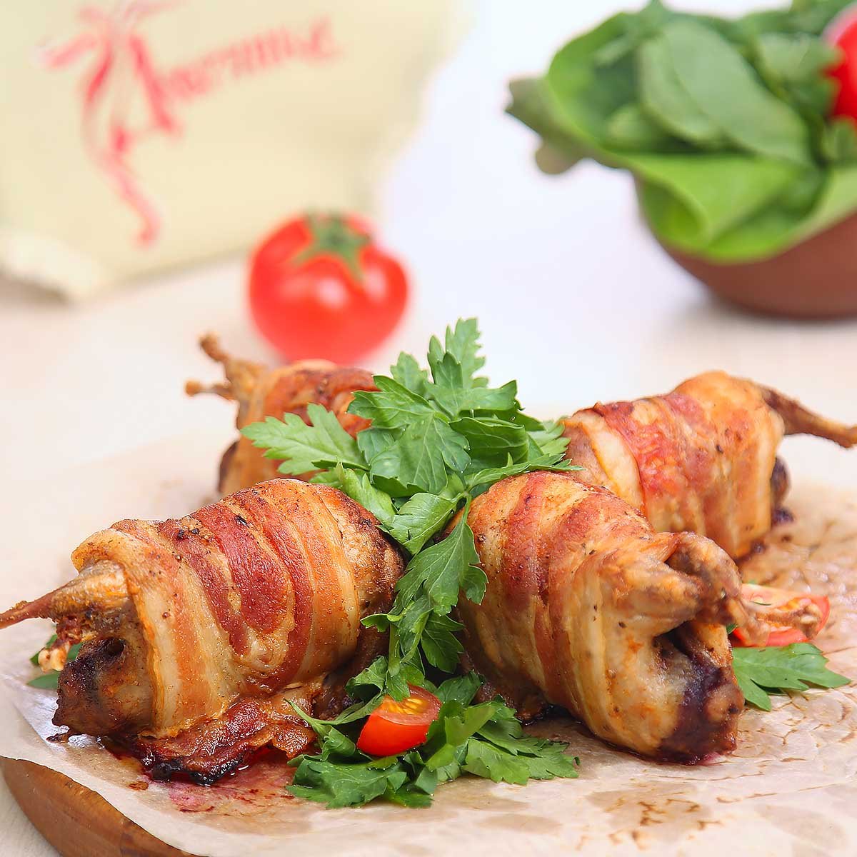 Вишня и грецкий орех мягко оттеняют нежный вкус целых тушек перепелов, запеченных в тонких полосках бекона. Оригинальная подача и пикантный вкус этого горячего не оставят разнодушными вас и ваших гостей