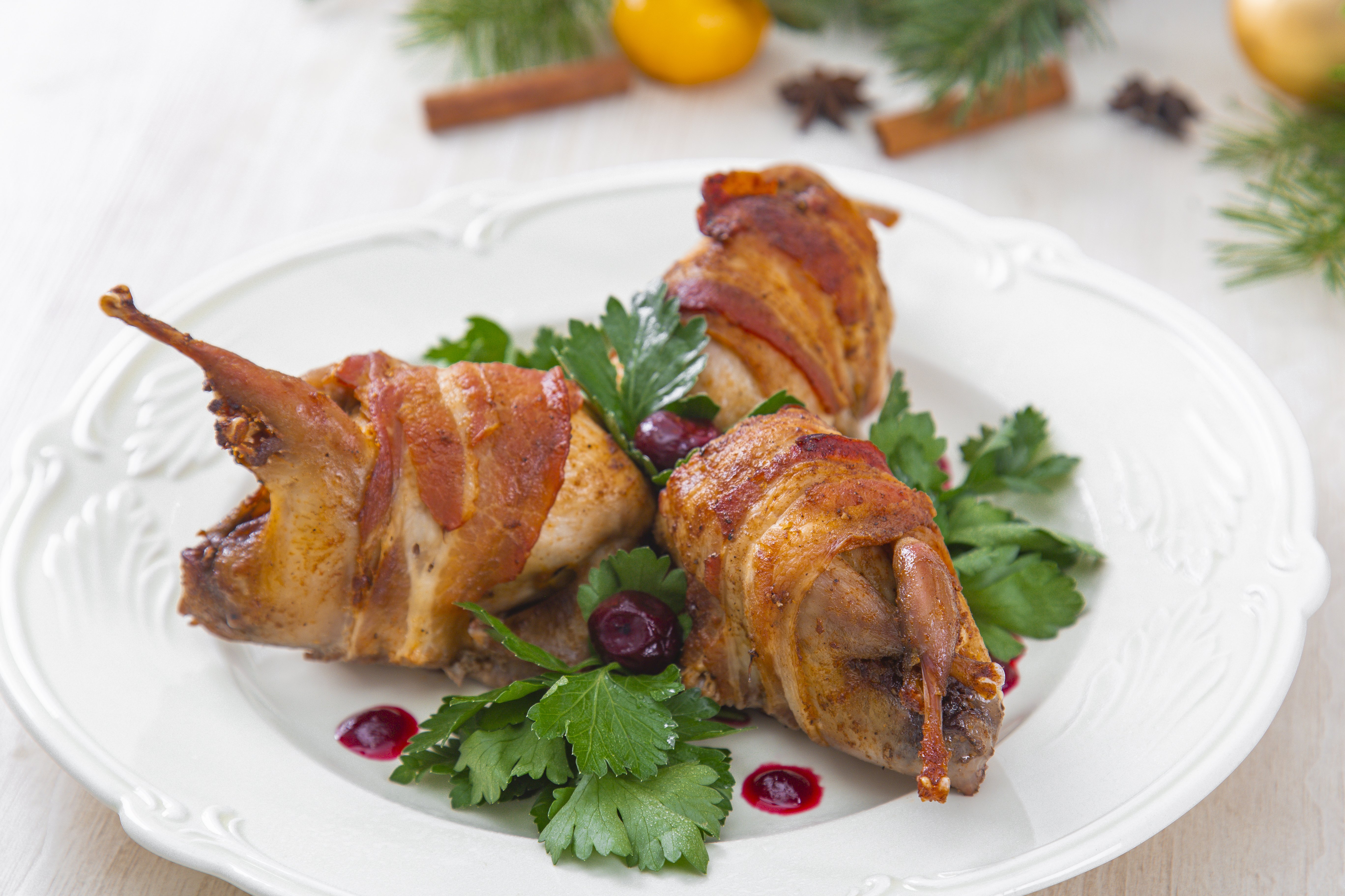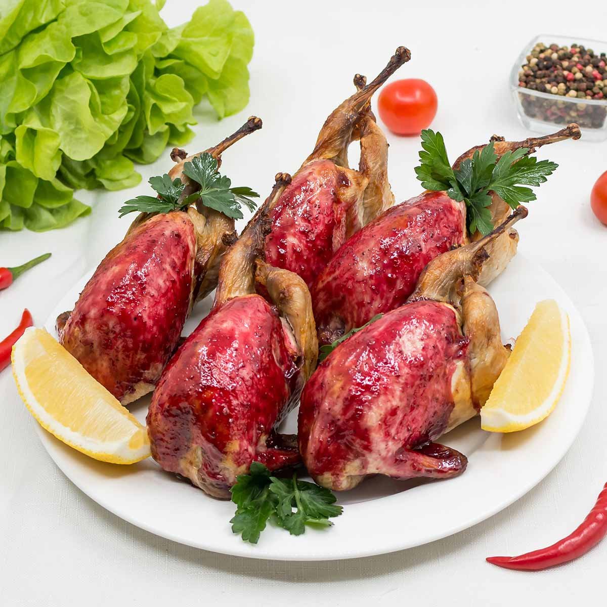 Перепела, вишня, бекон сырокопченый, масло сливочное, орех грецкий, масло подсолнечное, сахар-песок, паприка молотая, зелень петрушки, соль пищевая, перец черный молотый.