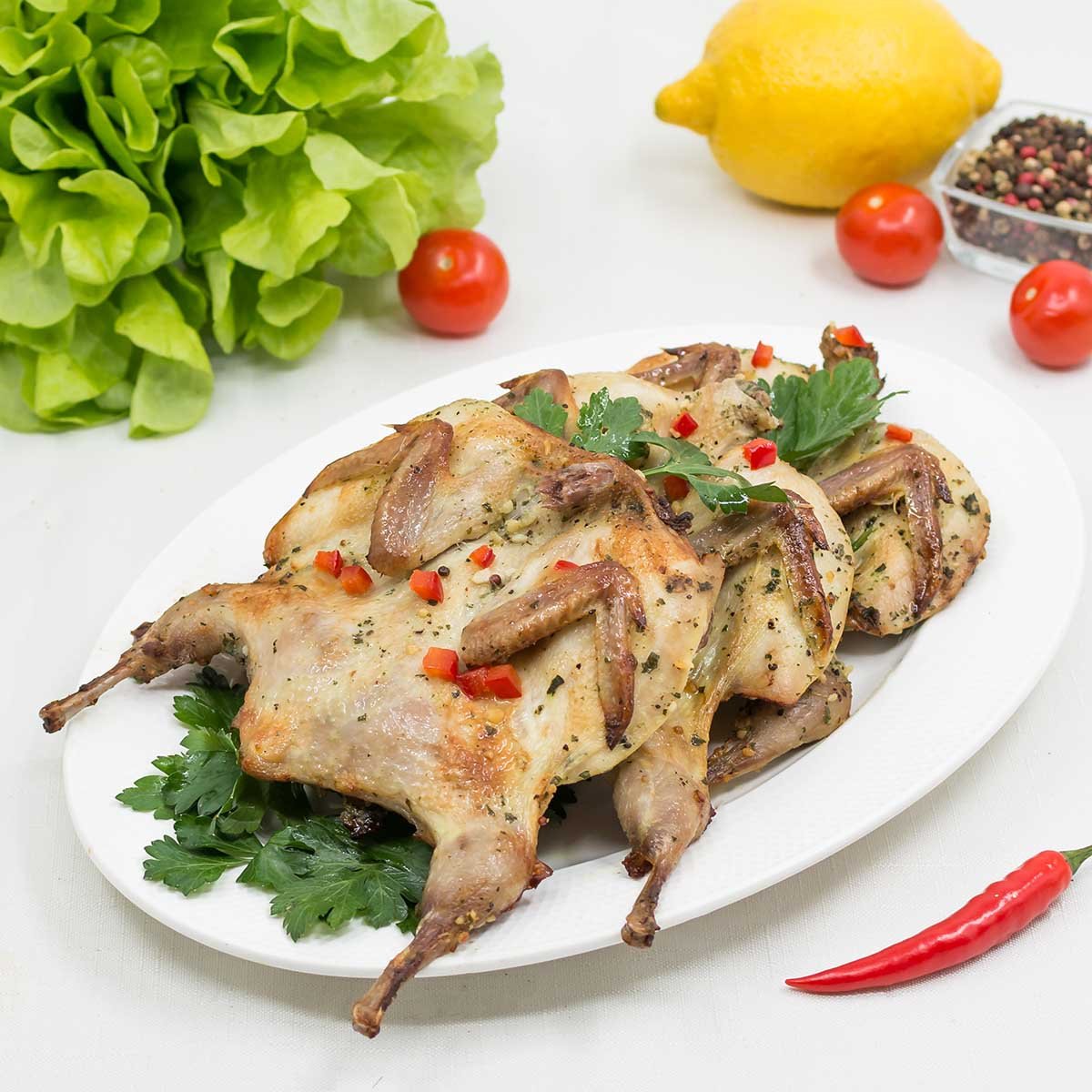Деликатное мясо перепела мы замариновали в пикантном, ароматном, чесночном маринаде и зажарили до хрустящей корочки. Сочное блюдо с яркими нотками перца чили и нежнейшим, чуть сладковатым вкусом птицы. Обязательно попробуйте с нашими гарнирами из картофеля.