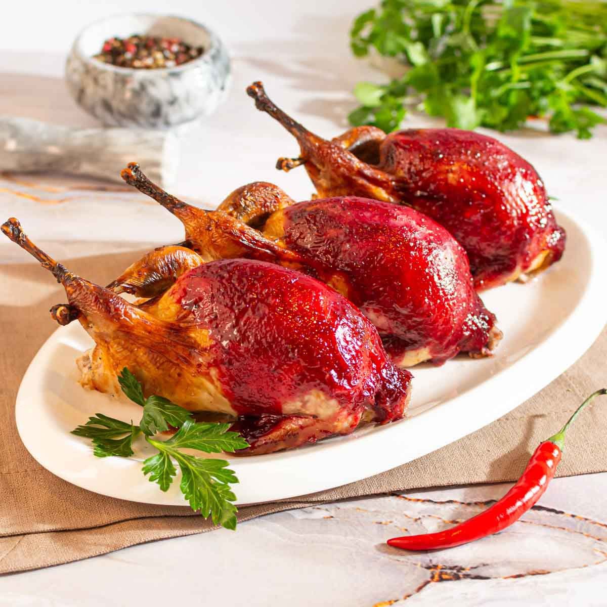Оцените изысканный вкус перепелок в брусничном соусе! Нежное мясо перепела, замаринованное в кефире с луком и чесноком, обретает пикантную мягкость и насыщенный аромат. Яркие ноты брусники в сочетании с кисло-сладкими яблоками и сахаром-песком создают идеальный соус, который подчеркивает натуральный вкус птицы. Каждая перепелка запечена до румяной корочки и украшена свежей зеленью петрушки. Это блюдо станет настоящим открытием для вашего стола! Заказывайте доставку и наслаждайтесь перепелками с неповторимым брусничным акцентом прямо у себя дома!