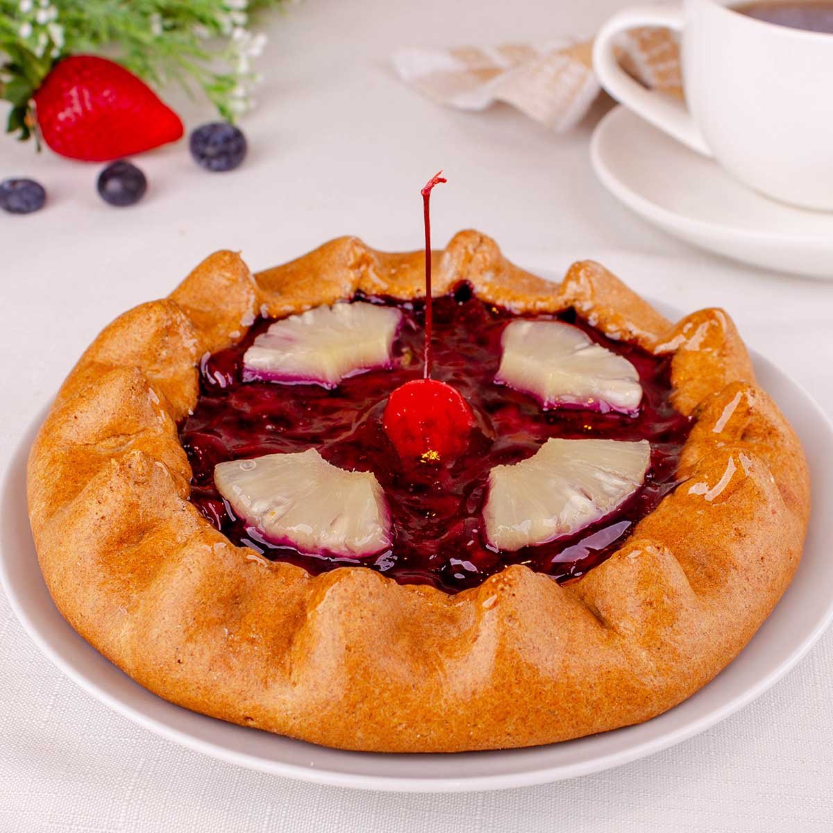 Возможно наличие косточек вишни. Ягода вишня, мука ржаная обдирная, сахар-песок, сметана, ананас консервированный, яйцо куриное, вишня коктейльная, гель кондитерский, крахмал, масло подсолнечное, соль, сода пищевая.
