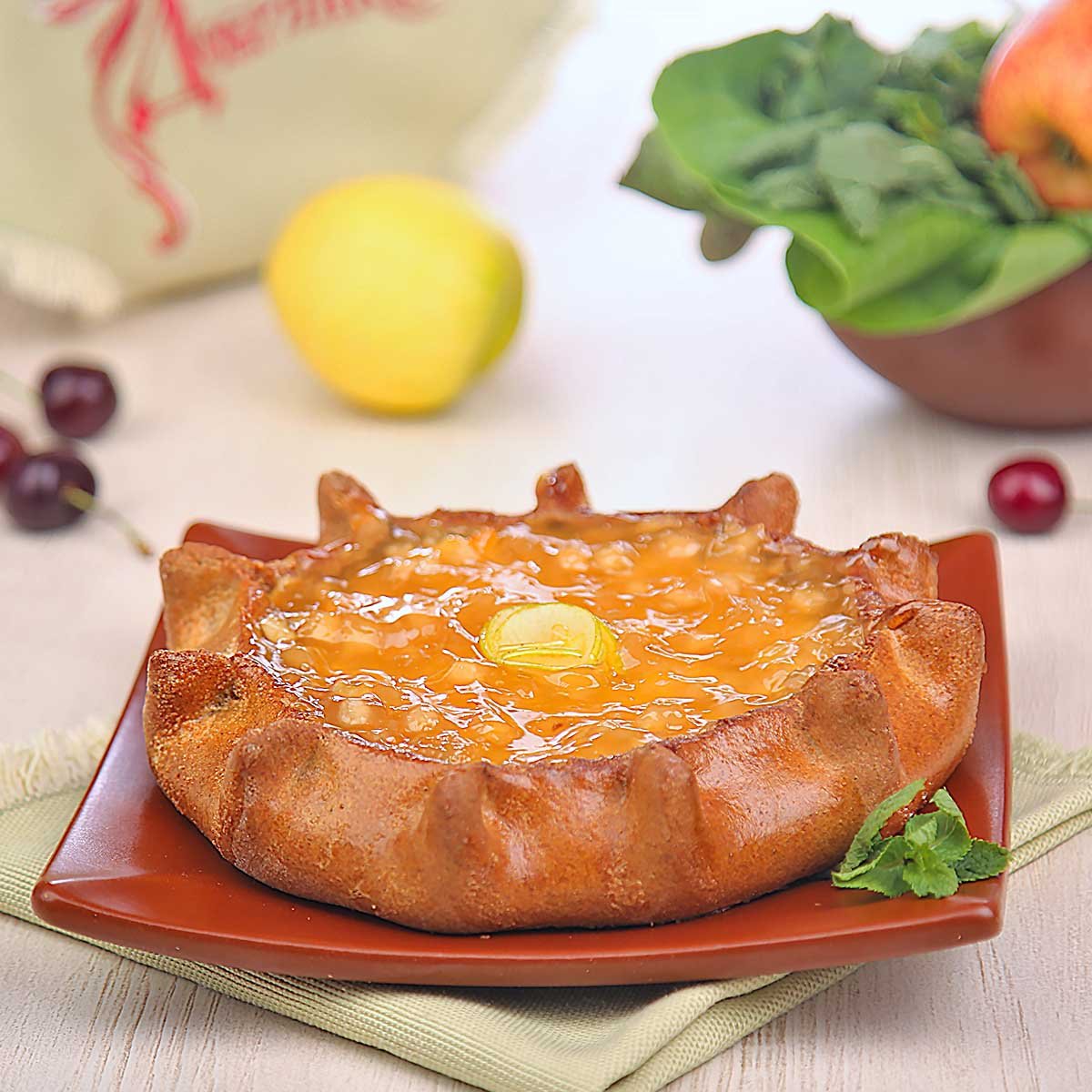 Яблоки, мука ржаная обдирная, начинка Яблоко, сметана, сахар-песок, масло сливочное, яйцо куриное, зелень Мята, масло подсолнечное, крахмал, гель кондитерский, соль, сода пищевая.