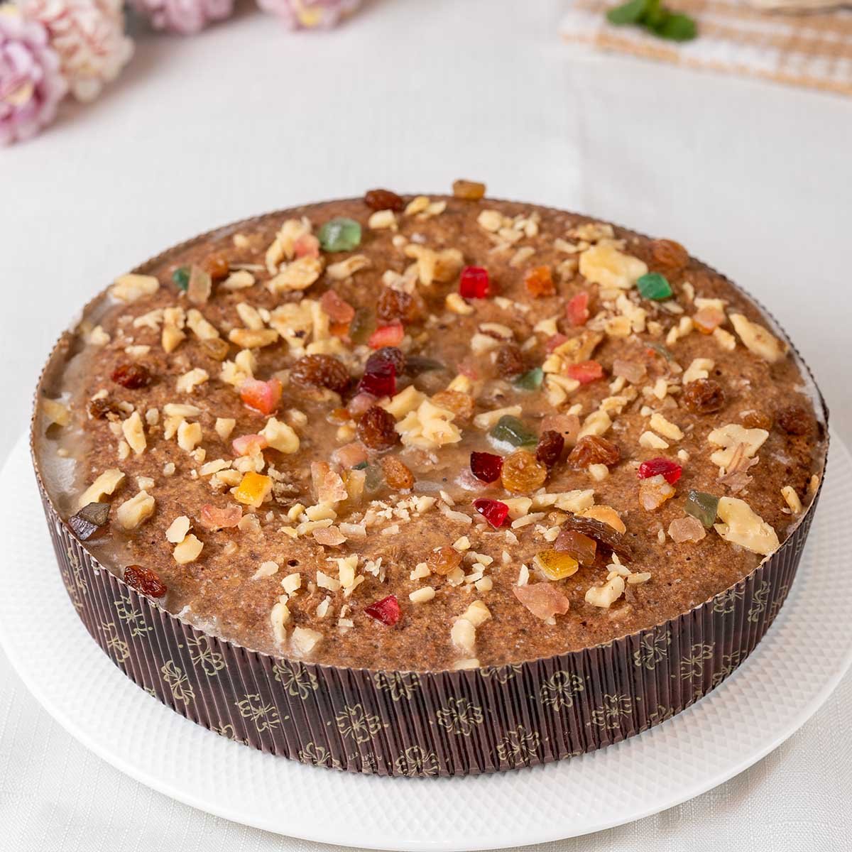 Апельсиновый сок, мука пшеничная в/с, сахар, масло подсолнечное, сахарная пудра, изюм, цукаты, орех грецкий, сода, соль.