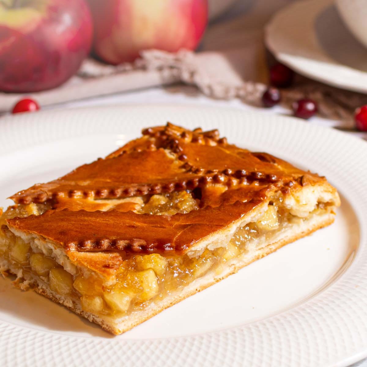 Яблоки, тесто (мука пшеничная в/с, молоко, яйцо куриное, масло сливочное, сахар, сметана, дрожжи, соль, масло подсолнечное), сахар, масло сливочное, яйцо куриное, крахмал, лимон.