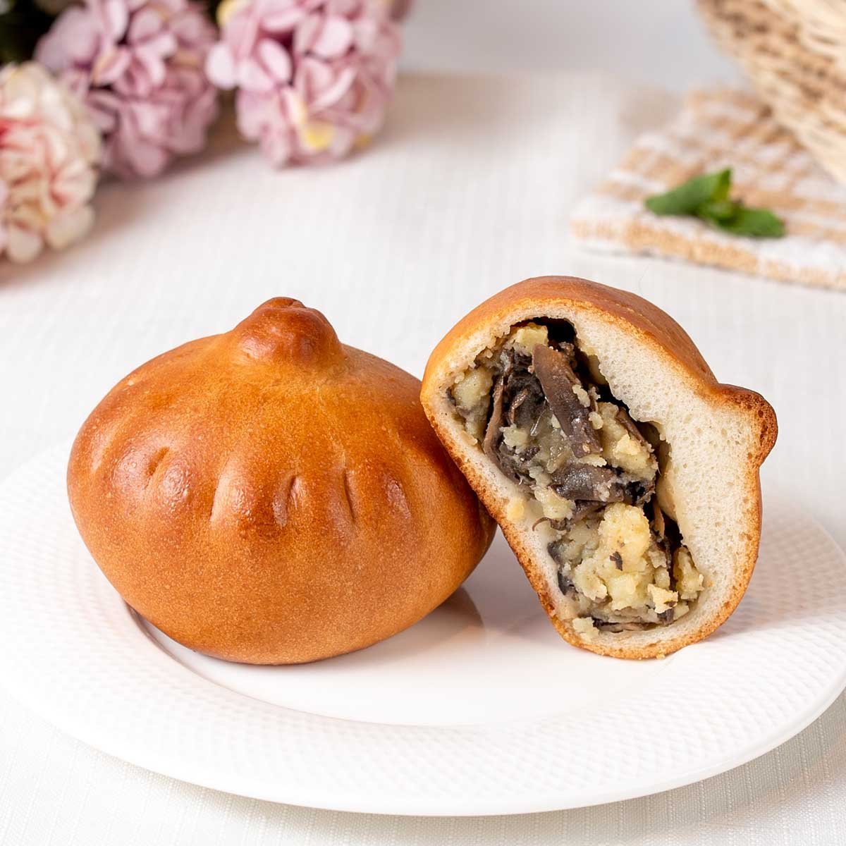 Тесто (мука пшеничная в/с, масло подсолнечное, сахар, дрожжи, соль), картофель, шампиньоны, лук репчатый, масло подсолнечное, соль, перец черный молотый.