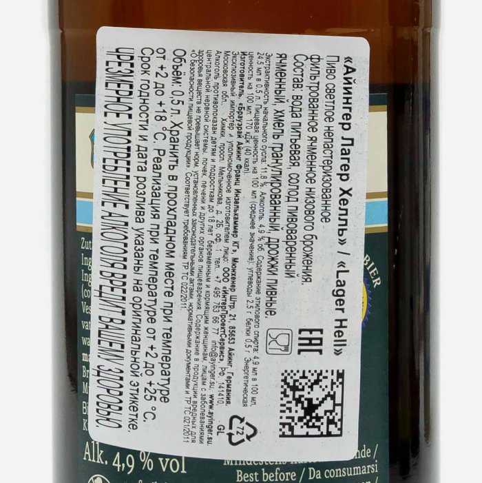 Пиво Айингер Лагер Хелль свет ячмен фильтр 4.9% ст/б 0,5л